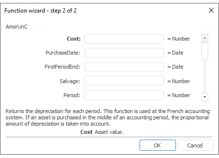The function wizard for the AmorLinC function looks as follows: