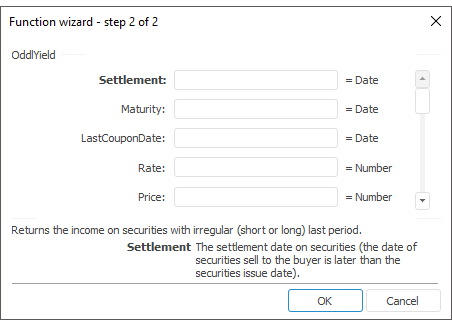 The function wizard for the OddlYield function looks as follows: