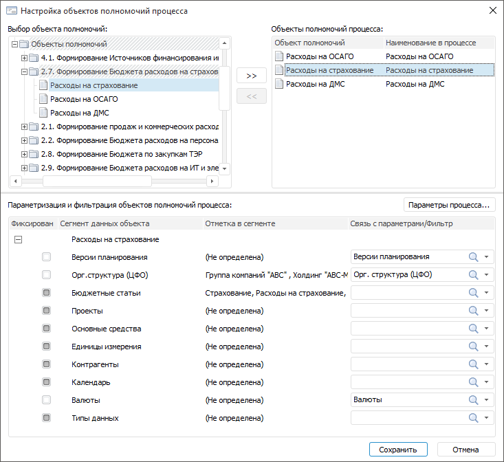 Область «Параметризация и фильтрация объектов полномочий процесса» содержит таблицу с перечнем сегментов данных и их измерений. В таблице также отображается отметка, заданная для измерений сегмента в объекте полномочий, и связь с параметрами процесса.