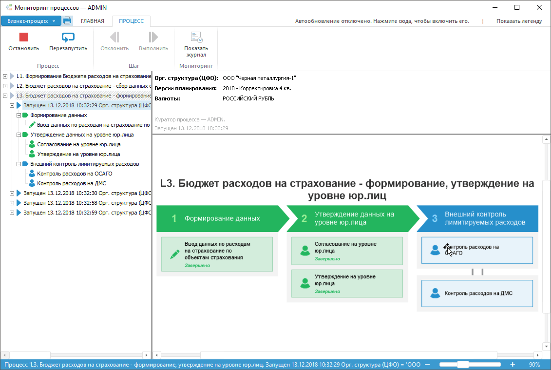 Для подпроцесса «Бюджет расходов на страхование – формирование, утверждение на уровне юр.лиц» с автоматическим способом исполнения экземпляры вложенных подпроцессов запустятся автоматически: