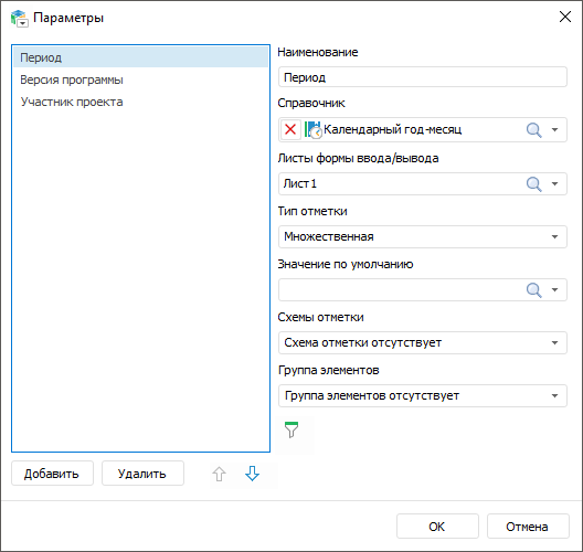 Параметр предназначен для динамического управления данными, отображаемыми в форме ввода. Например, в качестве параметра реестровой формы ввода выбран список организаций, при изменении отметки в параметре, в рабочей области формы ввода будут отображаться реестровые данные, соответствующие выбранной организации.