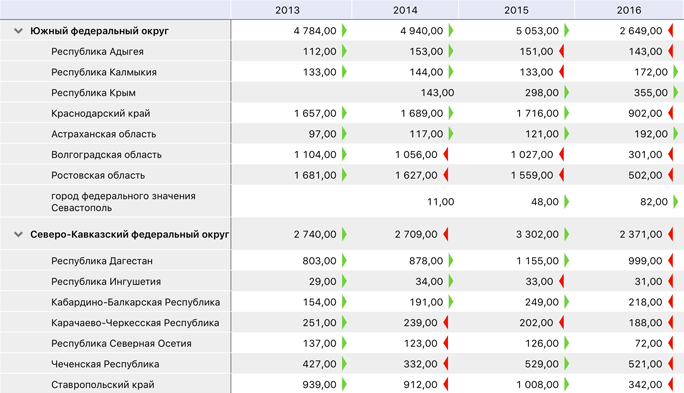 Зеленая стрелка показывает, что значение в ячейке больше, чем значение в ячейке слева. Красная стрелка показывает, что значение в ячейке меньше, чем значение в ячейке слева.