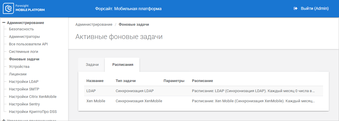 На вкладке «Задачи» отображается журнал с активными фоновыми задачами, которые выполняются в текущий момент по расписанию или происходят параллельно с платформой.