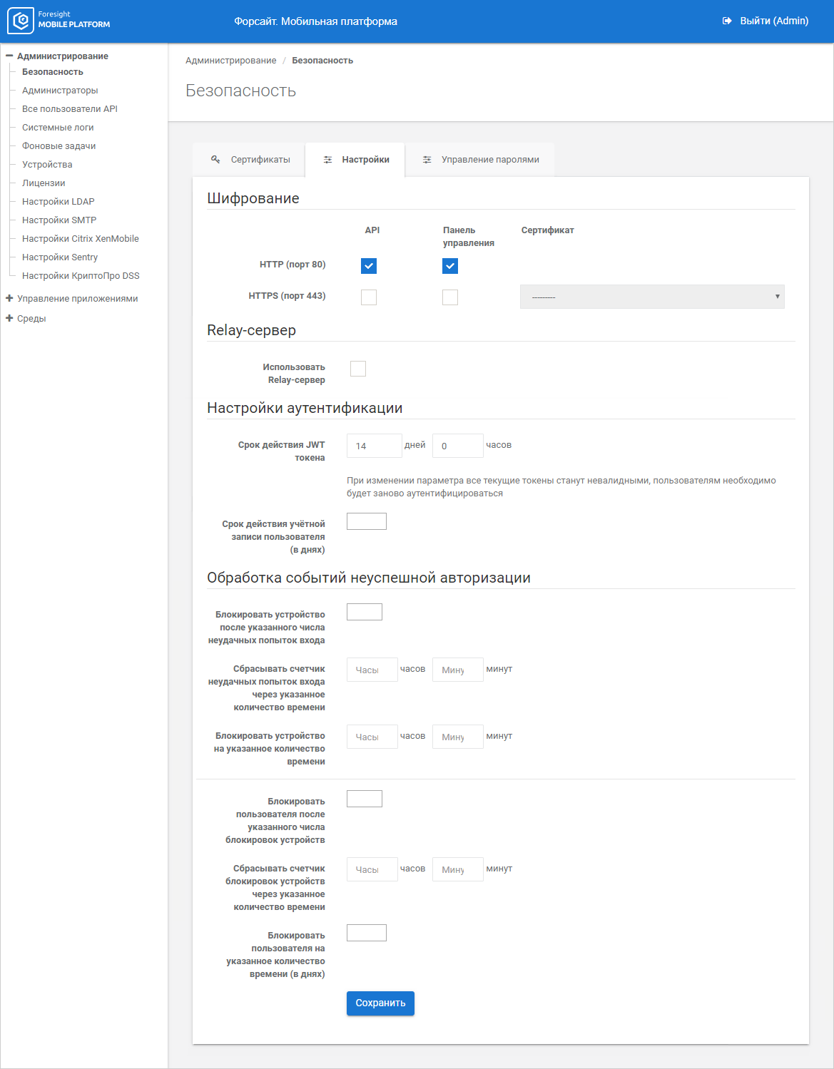 Для настройки параметров безопасности перейдите на вкладку «Настройки» в подразделе «Безопасность»: