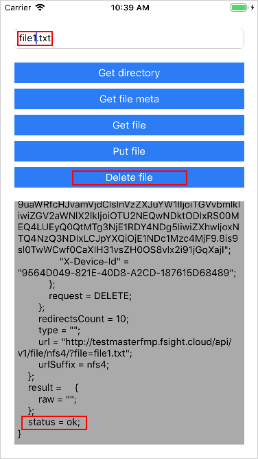Проверьте удаление файла file1.txt с сервера мобильной платформы с помощью кнопки «Get directory».