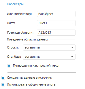 Лист. Список листов доступных для перемещения табличных данных. По умолчанию отображается наименование табличного листа, на котором расположена область данных.