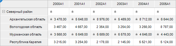 Настроим права доступа в источнике данных: установим ограничения на изменение данных для Архангельской и Мурманской областей. Так как в таблице одновременно располагаются ячейки, на которые у пользователя нет прав, а также ячейки вычисляемых элементов, то в таблице будут отображены сразу все пиктограммы: