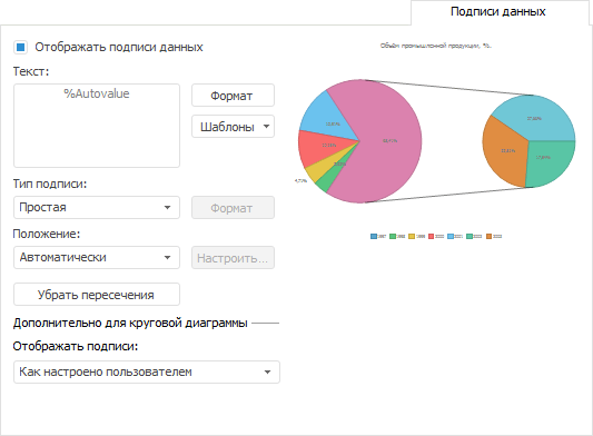 Для автоматического размещения подписей данных диаграммы, ряда или точки ряда используйте группу «Дополнительно для круговой диаграммы» на вкладке «Подписи данных» диалогового окна «Параметры диаграммы».