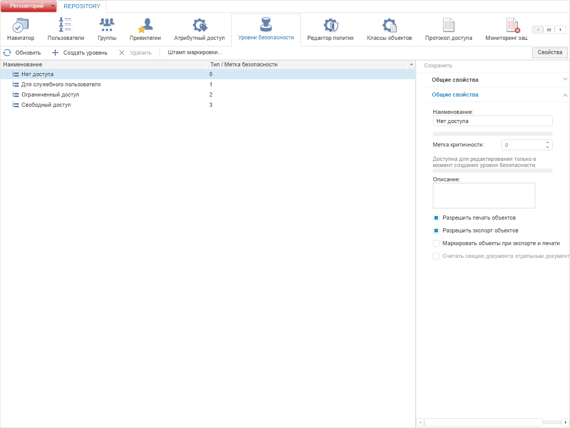 Примечание. При разделении ролей между администратором информационной безопасности и прикладным администратором раздел «Уровни безопасности» будет доступен только администратору информационной безопасности.