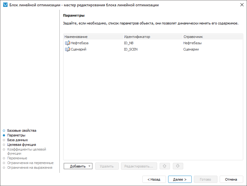 Добавление параметров блока линейной оптимизации расчёта выполняется на странице «Параметры блока» в мастере редактирования блока линейной оптимизации: