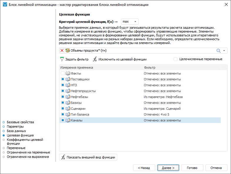 Выбор цели оптимизации целевой функции, управляющих переменных и приёмника данных, в который будут выгружены результаты оптимизации выполняется на странице «Целевая функция» в мастере редактирования блока линейной оптимизации:
