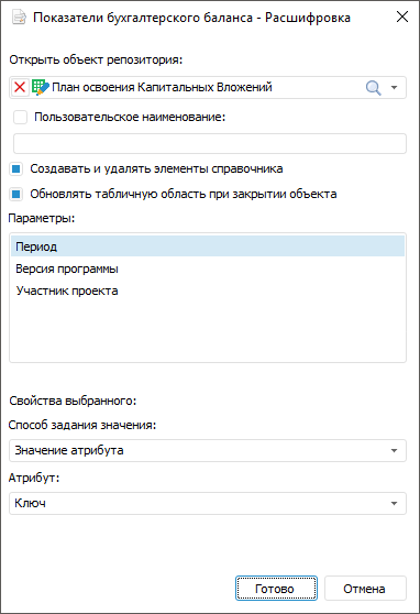Обновлять табличную область при закрытии объекта. Для автоматического обновления табличной области после внесения изменений в объект, в котором производилась расшифровка измерения, установите флажок «Обновлять табличную область при закрытии объекта». Флажок становится доступным после установки флажка «Создавать и удалять элементы справочника»;