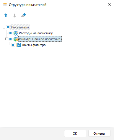 В окне отображается список показателей формы с их частными измерениями и измерений, выведенных в шапку. Показатели, которые используются в качестве фильтров, в списке не отображаются.