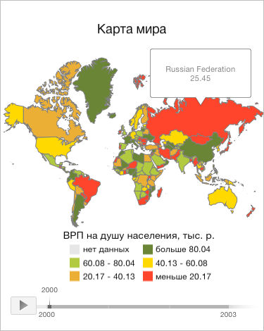 В результате выполнения примера для всех областей корневого слоя карты показаны границы серого цвета толщиной, равной 1 пикселю. Для области слоя карты с идентификатором «RU» была отображена всплывающая подсказка, в которой выведено значение за 2003 год, что соответствует индексу 3: