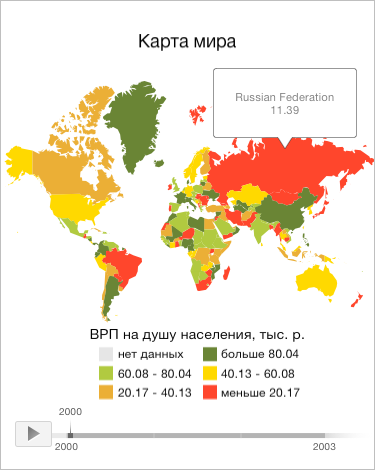 Затем вручную нажмём на область слоя карты с идентификатором «RU». В результате этого действия взаимодействие пользователя с временной осью будет запрещено. Вместо шкалы временной оси на экране будет отображена надпись, соответствующая текущему значению временной оси. Данные атрибута, содержащего название области карты, будут изменены. Всплывающая подсказка области карты будет скрыта и заново отображена с обновленными данными: