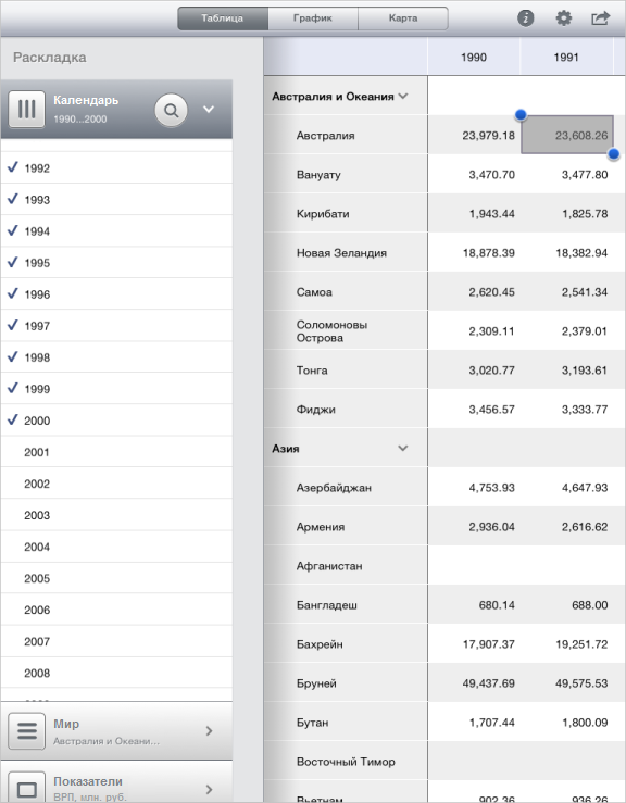 В результате выполнения примера на экране мобильного устройства будет отображен экспресс-отчет, содержащий таблицу, для которой установлено выделение одной из ячеек: