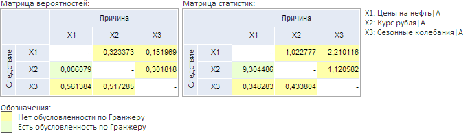 Тест выполняется одновременно для всех выделенных переменных. Рассчитываются матрицы вероятностей и статистик. Значения вероятностей сравниваются с заданным уровнем значимости. Малое значение вероятности говорит о возможной зависимости между переменными.