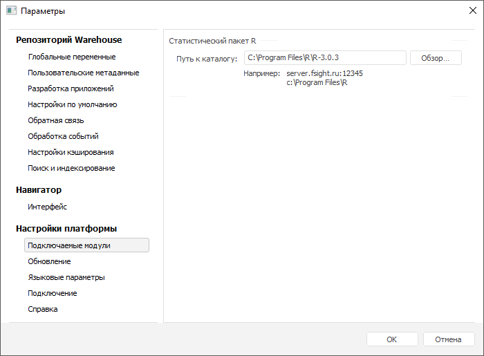 Примечание. Данный шаг необходим, если R установлен на рабочей станции отличной от рабочей станции, на которой установлен «Форсайт. Аналитическая платформа». Если пакет R установлен на той же рабочей станции, что и «Форсайт. Аналитическая платформа», то путь к каталогу R уже будет указан.