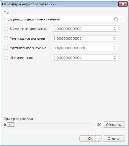 Данный тип редактора позволяет задавать значения десятичного типа с помощью ползунка: