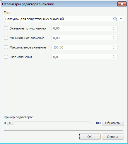 Данный тип редактора позволяет задавать значения вещественного типа с помощью ползунка: