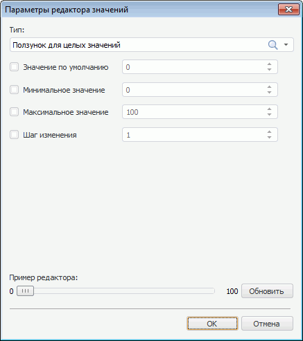 Данный тип редактора позволяет задавать целочисленные значения с помощью ползунка: