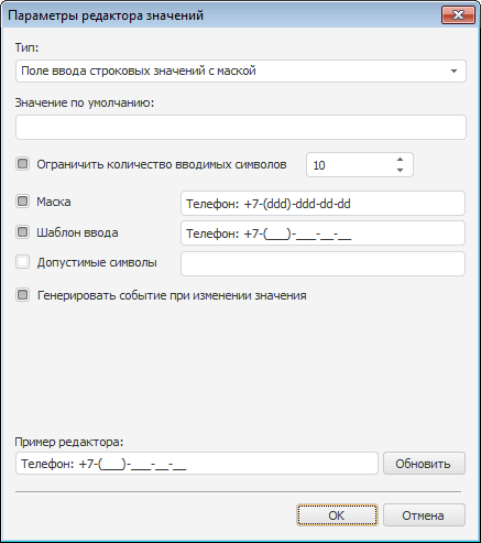 Поле ввода строковых значений с маской позволяет ограничить набор доступных для ввода символов и задать формат вводимого значения (или шаблон). Данный тип редактора может использоваться для ввода номеров телефонов, почтовых и других индексов, идентификаторов и др.