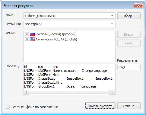 Файл. Укажите текстовый файл, в который будут экспортироваться ресурсы;