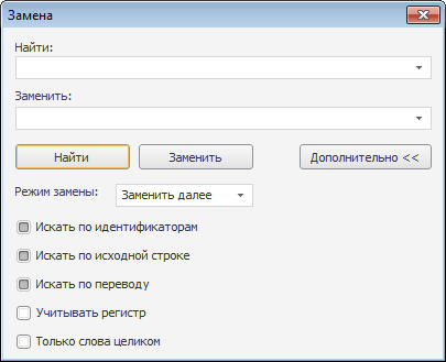 Фокус будет перемещен к первому найденному ресурсу, значение которого может быть заменено. Для замены текущего ресурса и поиска следующего нажмите кнопку «Заменить».