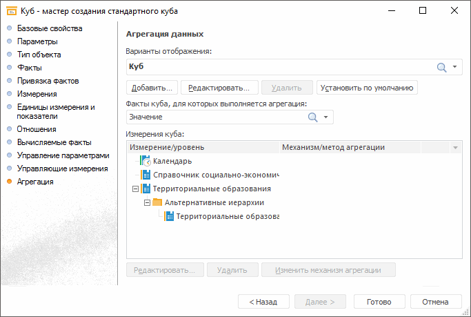 На данной странице настраиваются варианты отображения и агрегация для измерений куба. Подробное описание настройки различных механизмов агрегации представлено в разделе «Агрегация по уровням измерения». При открытии куба извлекаются неагрегированные данные. Агрегация данных производится непосредственно в открытом кубе на компьютере-клиенте.
