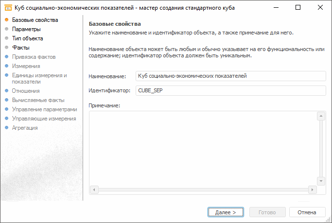На странице «Базовые свойства» задайте стандартные параметры куба: