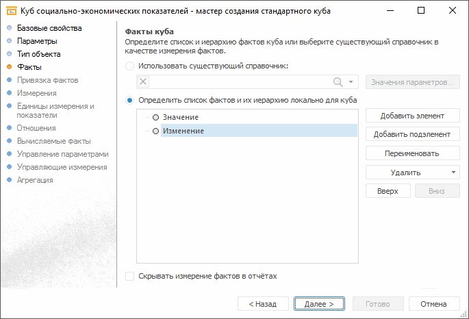 Установите переключатель «Определить список фактов и их иерархию локально для куба».
