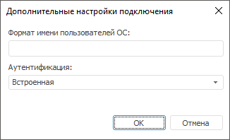 Окно с дополнительными настройками вызывается при нажатии соответствующей кнопки на странице «Свойства базы данных». В зависимости от типа СУБД набор дополнительных параметров будет разный.