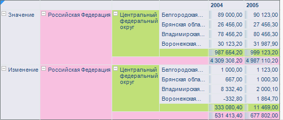 Рассмотрим область данных, для которой включено произвольное размещение, заданы дополнительные наименования элементов измерения, для заголовков и данных элементов заданы идентичные оформления: