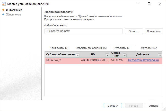 Примечание. Субъекты безопасности не имеющие прав доступа на объекты обновления, но присутствующие в файле обновления отображаются на вкладке «Объекты обновления».