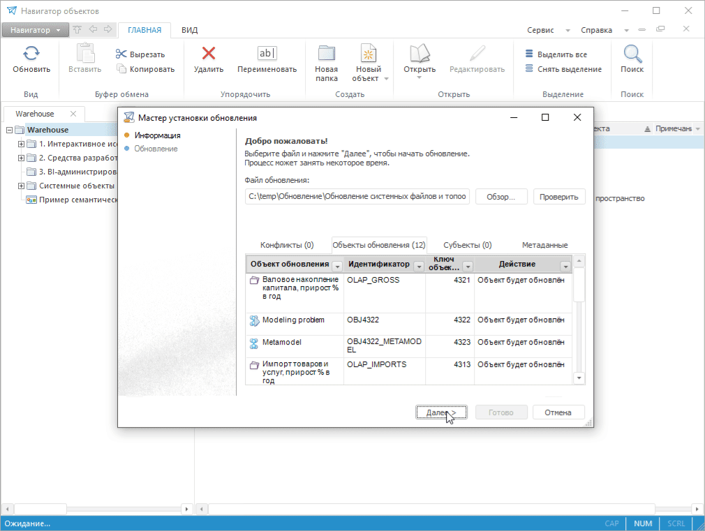 В навигаторе объектов откройте готовый файл обновления для установки.