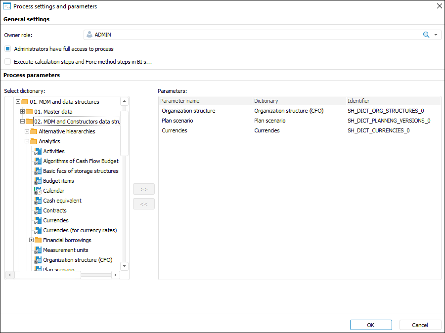 After process basic steps are set up, select dictionaries as process parameters on the Manage Parameters page.