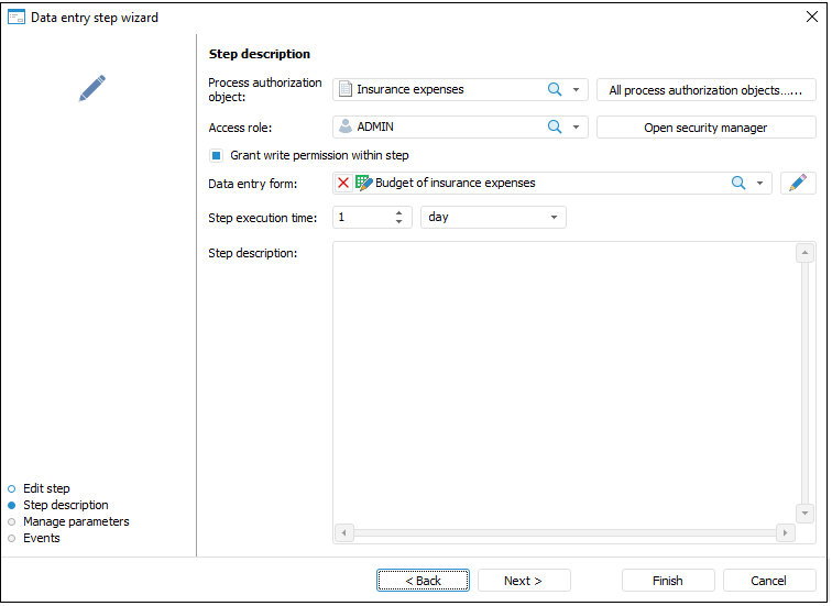 To determine time by which step must be finished, select the Finish Step By checkbox. On selecting the "minutes" or "hours" time measurement units, this box is hidden.