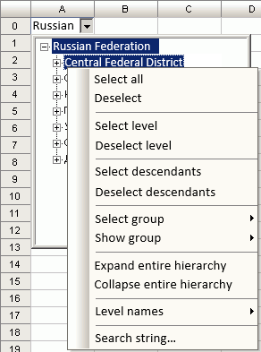Clicking the button sets the value editor for the A0 table cell. When the cell is edited, the dictionary drop-down list is displayed. The list of elements will contain elements included into dictionary group of elements, on the first opening the elements included into dictionary selection schema are selected. Identifiers are displayed as the first level element value, multiple selection option is on. After the selection is set, the cell value is generated from selected elements.