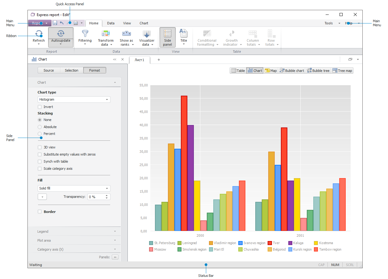 The ribbon enables the user to quickly find necessary commands. The commands are grouped logically and displayed on tabs. Each tab is related to the type of executed operation, for example, working with data or setting up page layout.