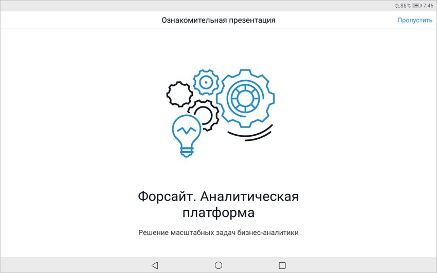 When the mobile application opens, the name Foresight Analytics Platform is displayed, and a demo presentation opens that shows key features of the mobile application: