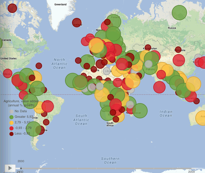 Bubble color and size depend on values of the metrics dimension elements that are mapped with the Color and Height map metrics.