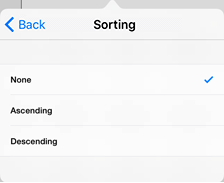 To set up sorting, tap the column or row header. In the dialog box that opens select the Sort item, after that the dialog box with sorting settings opens: