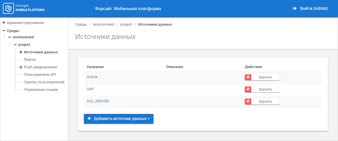 The mobile platform supports the data sources: SAP, Postgres Pro/PostgreSQL, Oracle, Microsoft SQL Server, 1С, SOAP, JSON, Microsoft Exchange Server, WEB services, Foresight Web, Foresight, file resources, and sending transaction data.