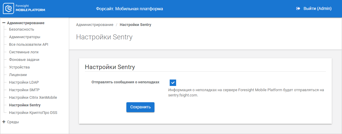 Select the Send Error Messages checkbox to collect and classify errors occurring at mobile platform server using sentry.fsight.com.