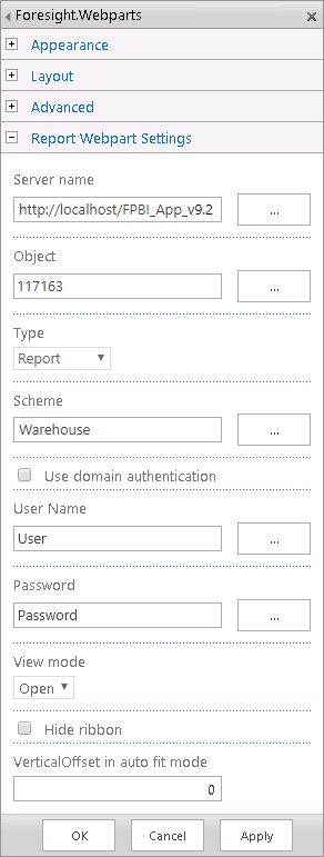 The Foresight.Webparts.wsp file that is a solution where the web part of Foresight Analytics Platform is created, which will be further added to Microsoft SharePoint web page. The web part allows for displaying any report (express report, regular report, dashboard, and so on) on the web page.