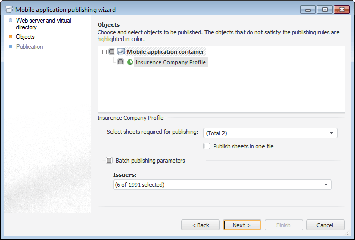 Select the report sheets to publish in the drop-down list. All regular report sheets are selected by default, and each report sheet will be published into a separate PDF file. To publish report sheets into a single PDF file, select the Publish Sheets in One File checkbox.