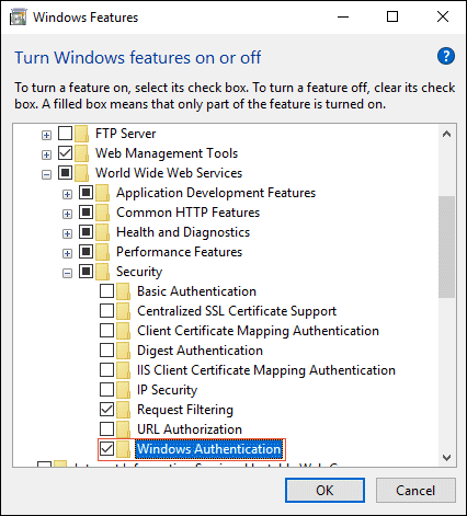 For BI server application, open Authentication in the list of functions, select the Windows Authentication checkbox and disable other settings.