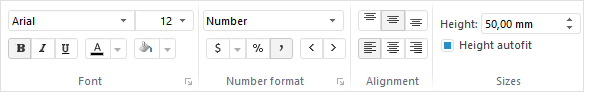 To set up title appearance, use the groups of commands: Font, Number Format, Alignment, Sizes, located on the Title ribbon tab.