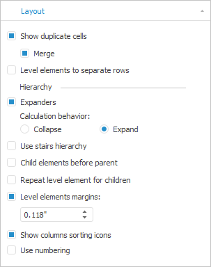 If a dimension or a level of the table is selected, settings for applying to table dimension/level will be available on the Layout tab: