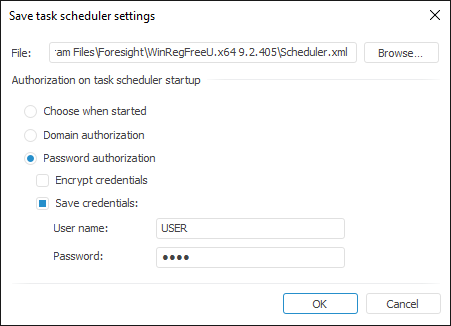 In the dialog box used to save settings for task scheduler, it is possible to chose the place where the file will be stored, name and authorization type which will be specified in settings. By default the Encrypt Credentials and Save Credentials checkboxes are not selected, therefore the user name and the password need to be specified in the Database Authorization dialog box at the task scheduler start.